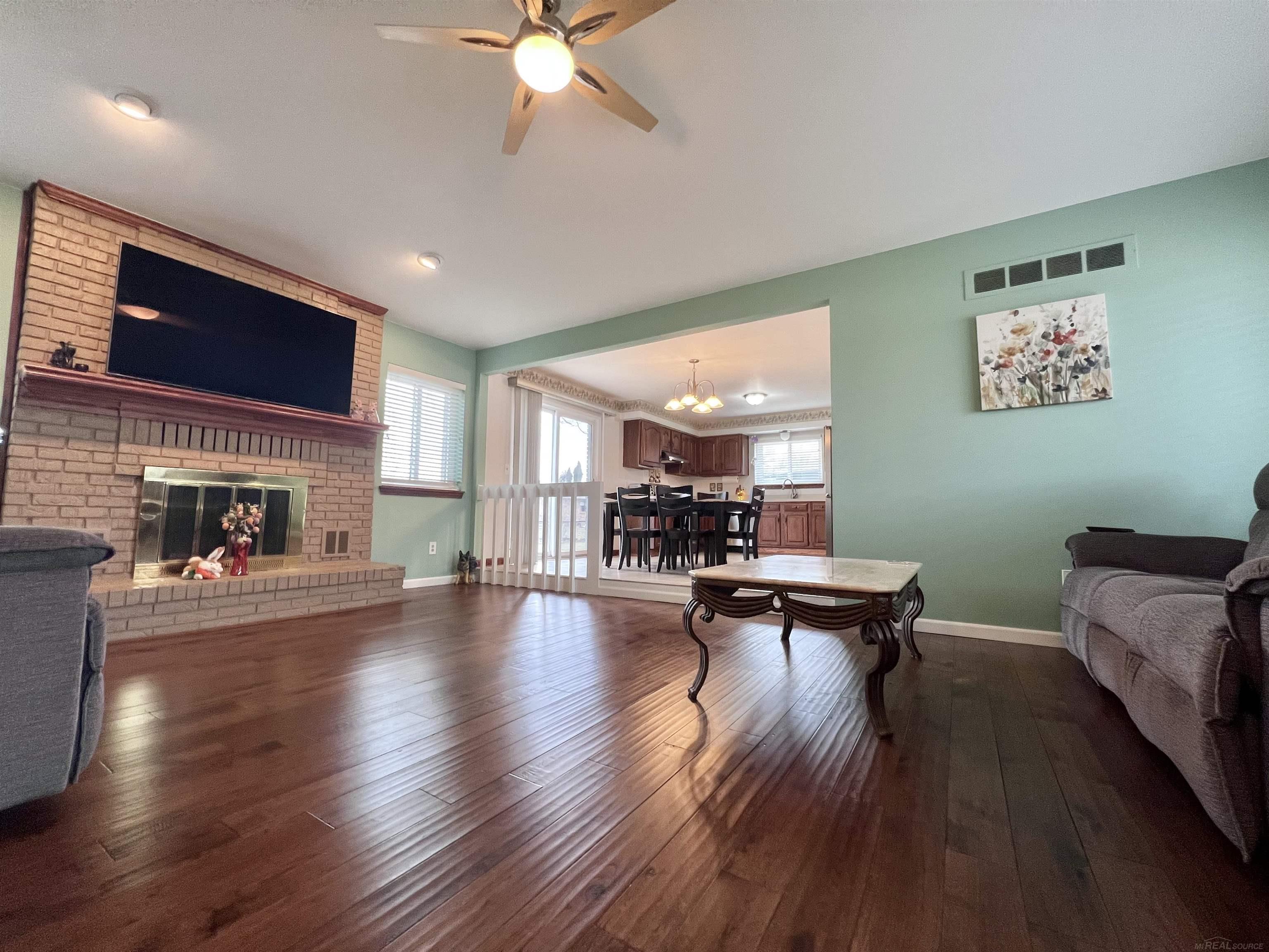 Prime Location! The home’s cul-de-sac location is a secluded site offering a more peaceful setting! Full brick ranch with attached 2 car garage! Automatic opener and side access door to backyard. Its stunning! All you have to do is move in. It is walking distance of the Clinton-Macomb Public Library (Main Branch) and the surrounding civic campus. So much to enjoy there! The interior has many updates. Gorgeous flooring and trim! Custom hand-shaven hardwood floors run through the great room and hallway, complemented by upgraded white trim, 6-panel doors, and new interior hardware. Kitchen has a modernized feel with walnut-stained wood cabinets, neutral ceramic tile, and a newer Frigidaire Gallery stainless steel appliance package, including a 5-burner gas stove! Enjoy entertaining here! Door wall off the eating area to cement patio and the oversized fenced yard! Open layout with great room featuring a fireplace and a custom 7 ft long wood mantel. You will love these hardwood floors! Three generously sized bedrooms and two full baths! The primary bedroom includes a doorwall to backyard and shared access to a full bath. Double wide closets. All bedrooms have ceiling fans. White faux blinds throughout. Painted in 2024. Knockout finished basement! Entertainment ready! A stunning, spacious family room with new plush light grey carpeting! Home office includes a dedicated office space, perfect for remote work or it can be a great gaming room. 2nd full bathroom featuring a tiled floor & walk-in tiled shower! You will love the staircase! Updated with an open design, hanging light fixture and modern black iron spindles. Very nice outdoor living space! It has a fully fenced yard with a large cement patio and oversized wide yard. A double-door shed built on a solid cement foundation is perfect for outdoor games, equipment and tools. Fantastic curb appeal! Full brick exterior with a premium fiberglass wood-grain front door! Pella storm door & for the warm months, pop in the screen door. Covered front porch! System upgrade includes a newer furnace and hot water heater, plus a sump pump with a water-driven backup system for peace of mind.
