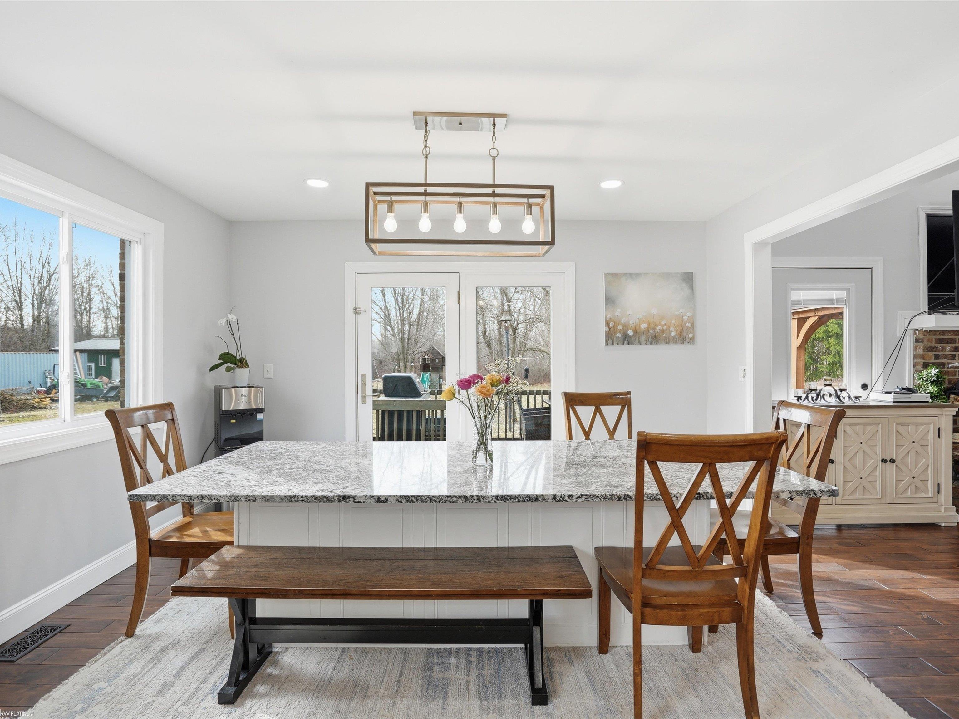Beautifully updated brick split-level home situated on 10 private acres, set well back from the paved road for exceptional privacy. Conveniently located with easy access to I-94 just 7 miles away, while shopping centers and two medical hospitals are within 5 miles. Lake St. Clair is only 2.5 miles away an ideal location for lake lovers. This spacious home features 4 bedrooms and 3 full bathrooms, including a primary suite with a walk-in closet and private walkout access to the deck. A convenient entry-level home office makes working remotely comfortable and practical. Hardwood floors add warmth and character throughout the main living areas. The updated kitchen is designed for both everyday living and entertaining, featuring waterfall granite countertops, a matching granite dining room table, stovetop, and double oven. The dining area also offers walkout access to the deck, creating a seamless indoor-outdoor flow perfect for gatherings. The finished basement provides additional living and storage space, including a room with double closets ideal for organization, storage, or flexible use. Outside, the property is designed for outdoor living and recreation. Enjoy a large entertaining deck, volleyball court, and a private fishing pond.